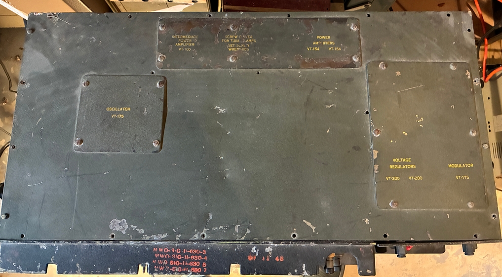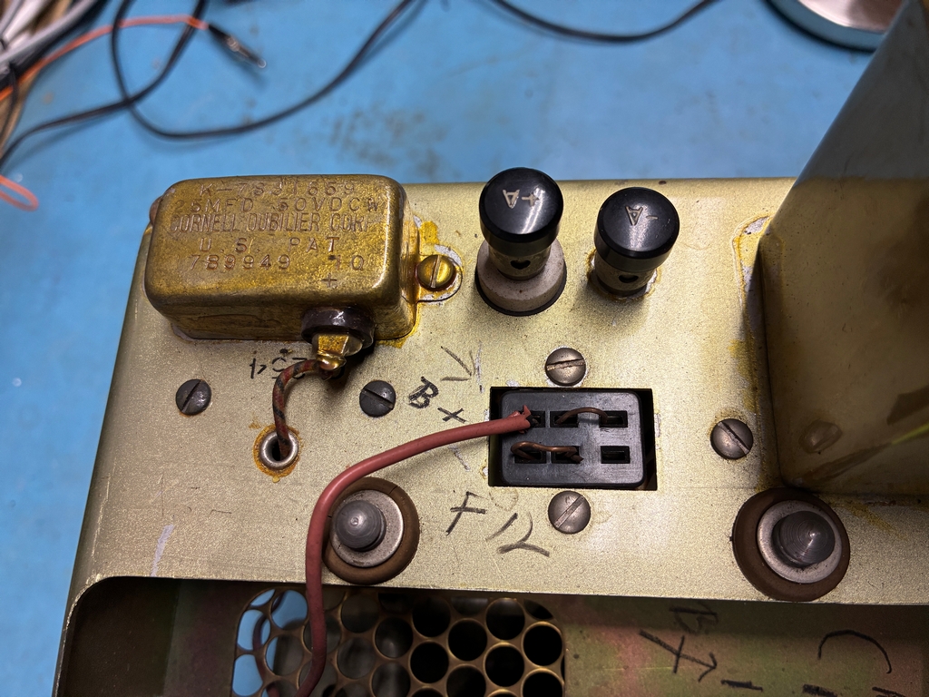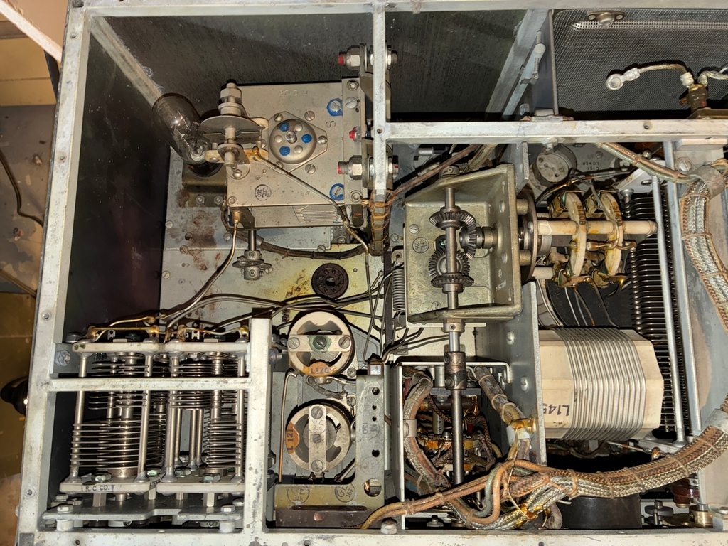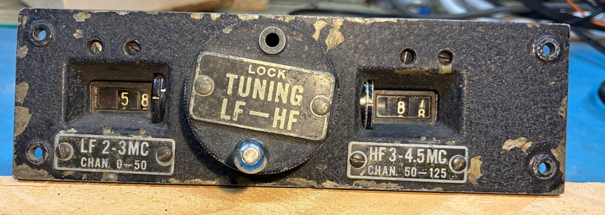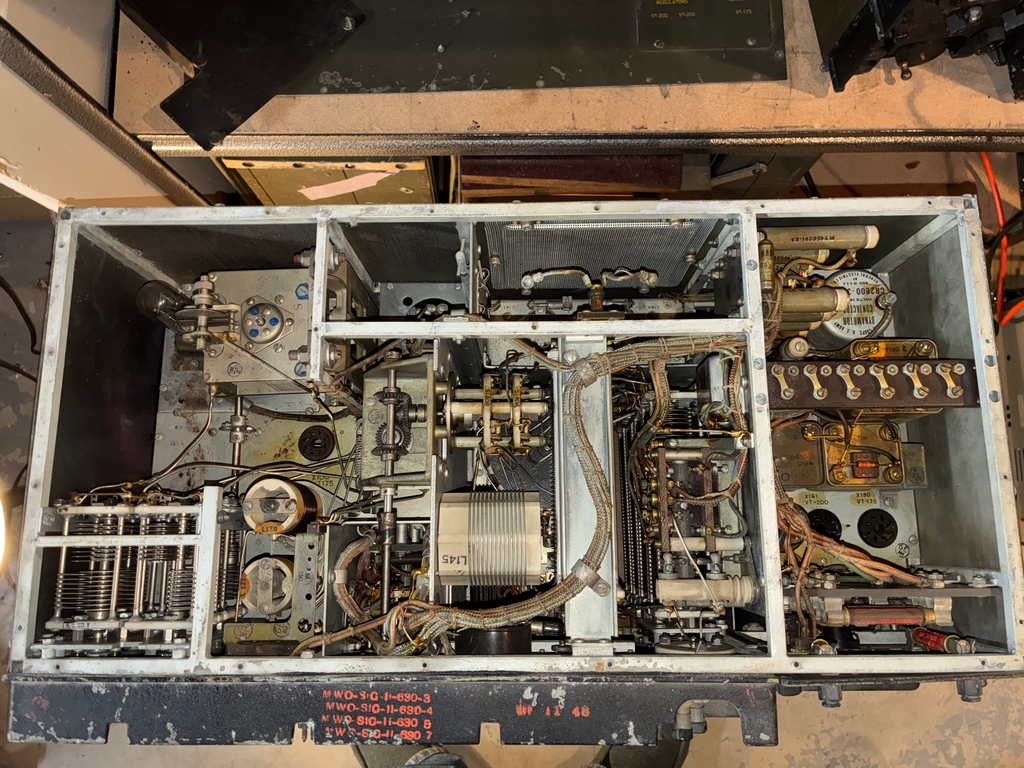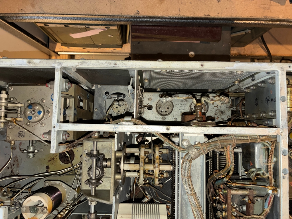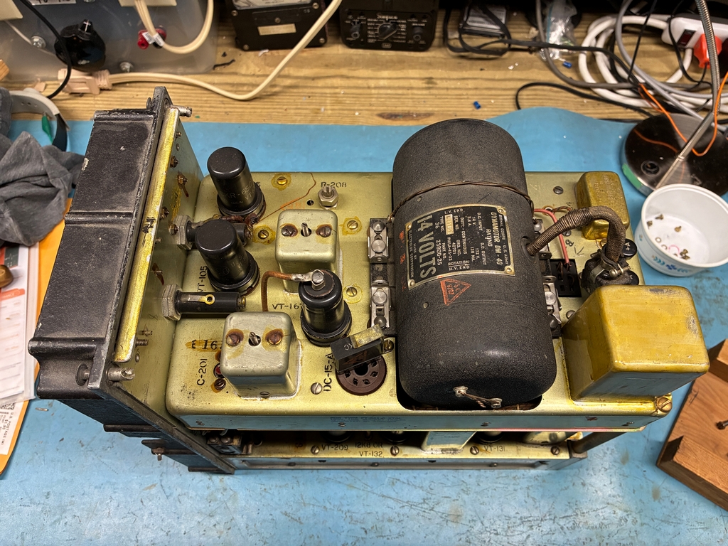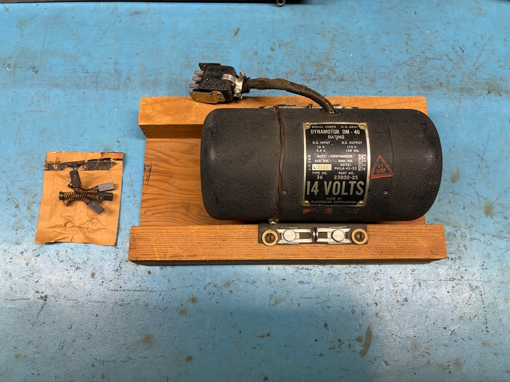 As can be seen in the above photo, the receiver has been modified to use external power. I have a DM-40 dynamotor for the receiver; since it's still bolted to its shipping platform and comes with an unused set of brushes, it has probably never been used. Here's some photos with the dynamotor placed in the receiver. The Cinch-Jones socket would need to be “unmodified” to mate with the dynamotor plug. |
