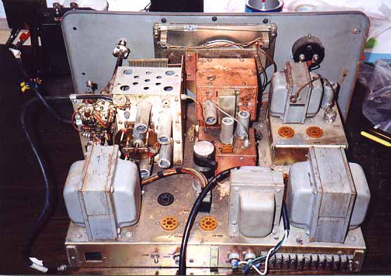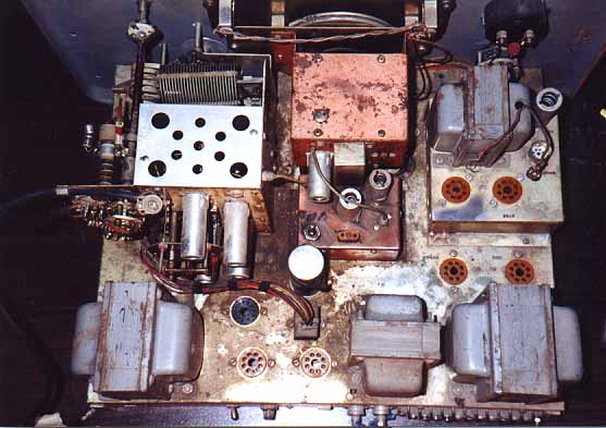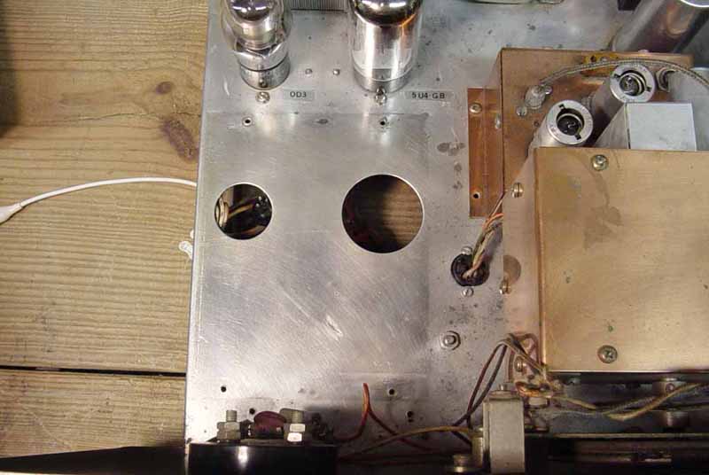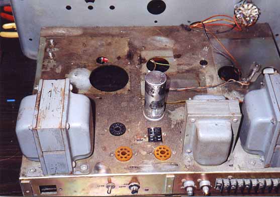 With all the subassemblies removed, the first task was to clean up the main chassis. Soap and water, as well as Isopropyl Alcohol, had little effect on a great deal of the chassis. A combination of Rust Remover (by Klean Strip) and fine steel wool did the trick though. However, in the process, the copper plating on the top of the chassis was removed, as were all of the tube, connector, and bias pot labels. For a chassis in this condition, I really do not know of a way to save the copper plating.