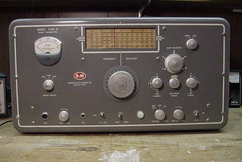 The B&W 5100B transmitter was produced between 1956 and 1961 by the Barker & Williamson Company of Bristol PA (near Philadelphia). This transmitter offered both AM and CW on the 80, 40, 20, 15, 11, and 10 Meter Amateur Bands. The unit has a self contained power supply and tips the scales at 85 pounds.