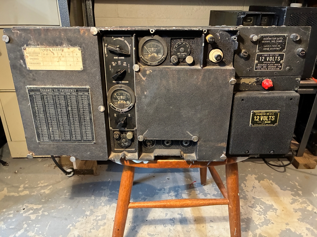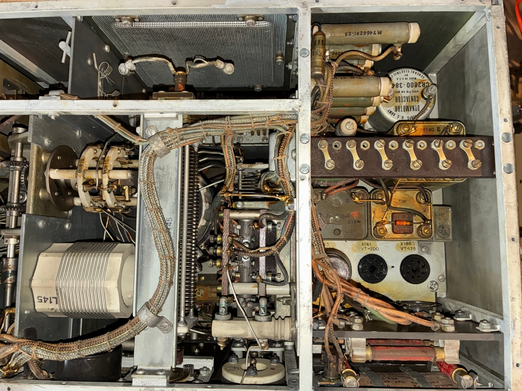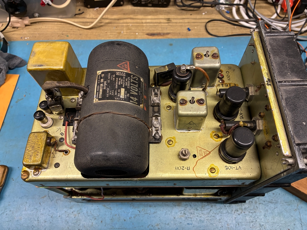 As can be seen in the above photo, the receiver has been modified to use external power. I have a DM-40 dynamotor for the receiver; since it's still bolted to its shipping platform and comes with an unused set of brushes, it has probably never been used. Here's some photos with the dynamotor placed in the receiver. The Cinch-Jones socket would need to be “unmodified” to mate with the dynamotor plug. |