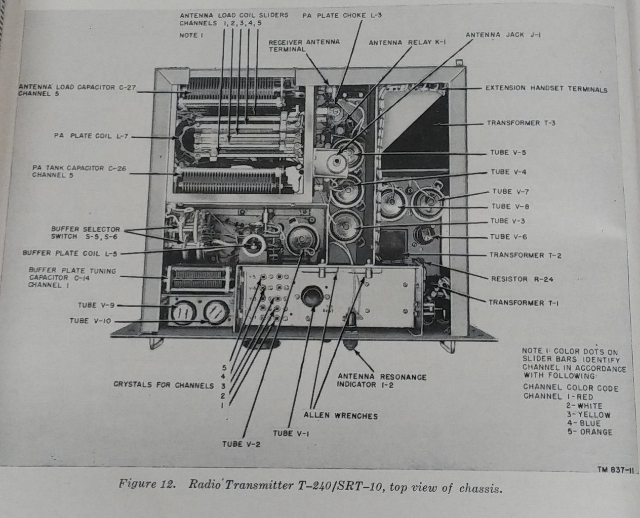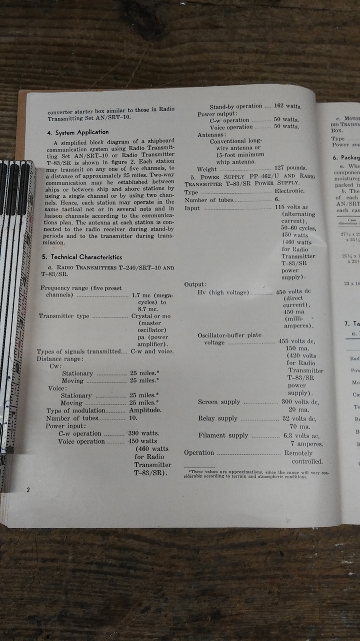 “Radio Transmitting Set AN/SRT-10 and Radio Transmitter T-83/SR are 50-Watt telephone and telegraph marine radio transmitters designed for use on small ships. Either c-w (continuous wave) or phone transmission is available on any of five preset channels in the frequency range between 1,700 and 8,700 kc (kilocycles)." |