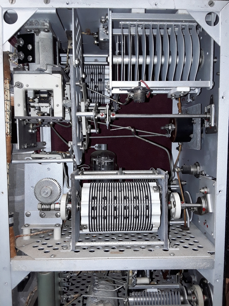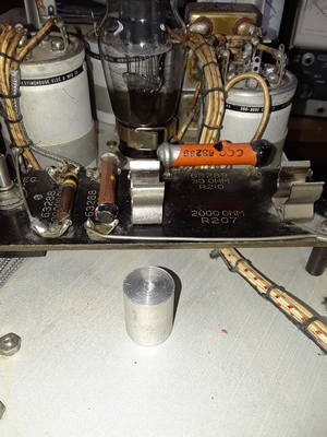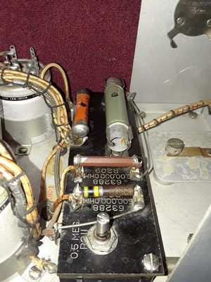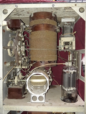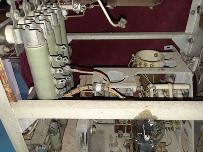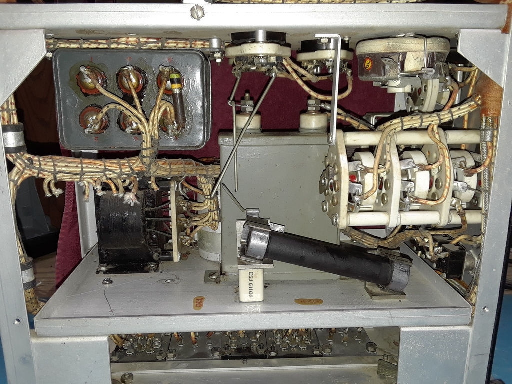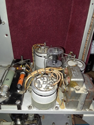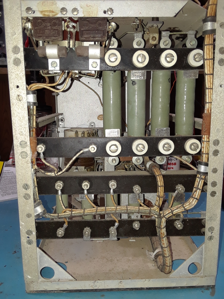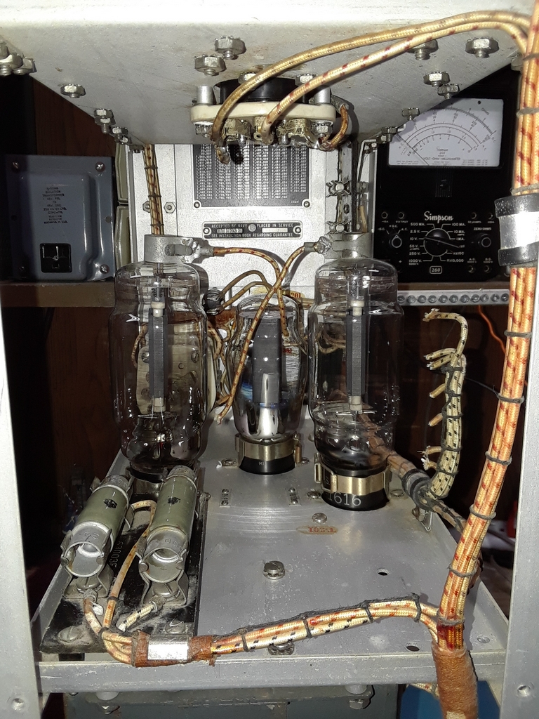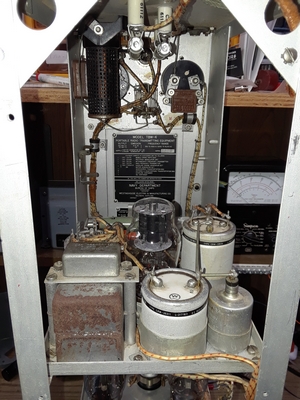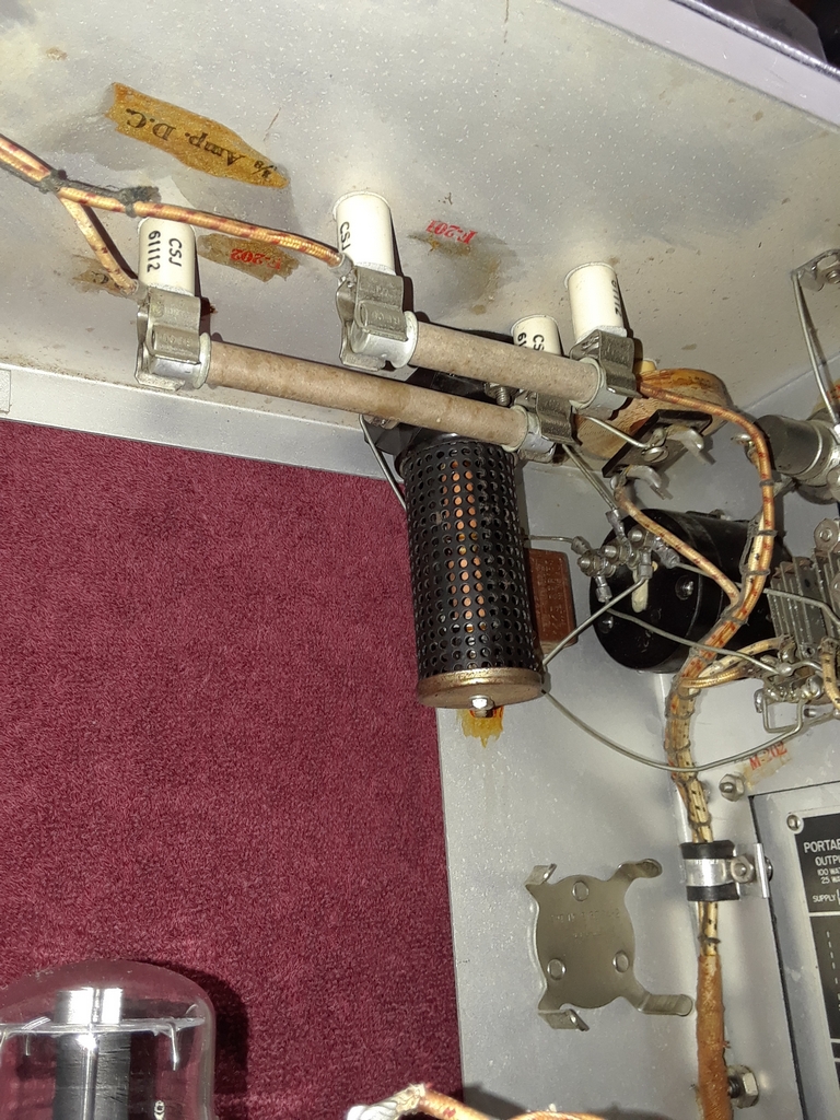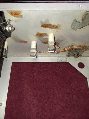 The large cage behind the line voltage / PA filament voltage meter is R-206, the meter multiplier resistor used when measuring the line voltage. |