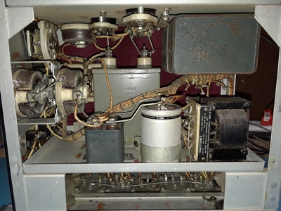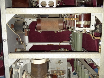 The wires to the left of variometer L109 are for C-124 (I think...) which is missing. This is a 0.005 uF 3 KV Mica capacitor. Note that the 807 Intermediate Amplifier Tube is missing! When I initially saw the radio the 807 was in a socket sitting unsecured to the frame with all the socket wires cut! The socket was not from the TBW and it was corroded with the base of the 807. The socket wiring is there and unharmed. I have no idea what a previous owner had in mind. |